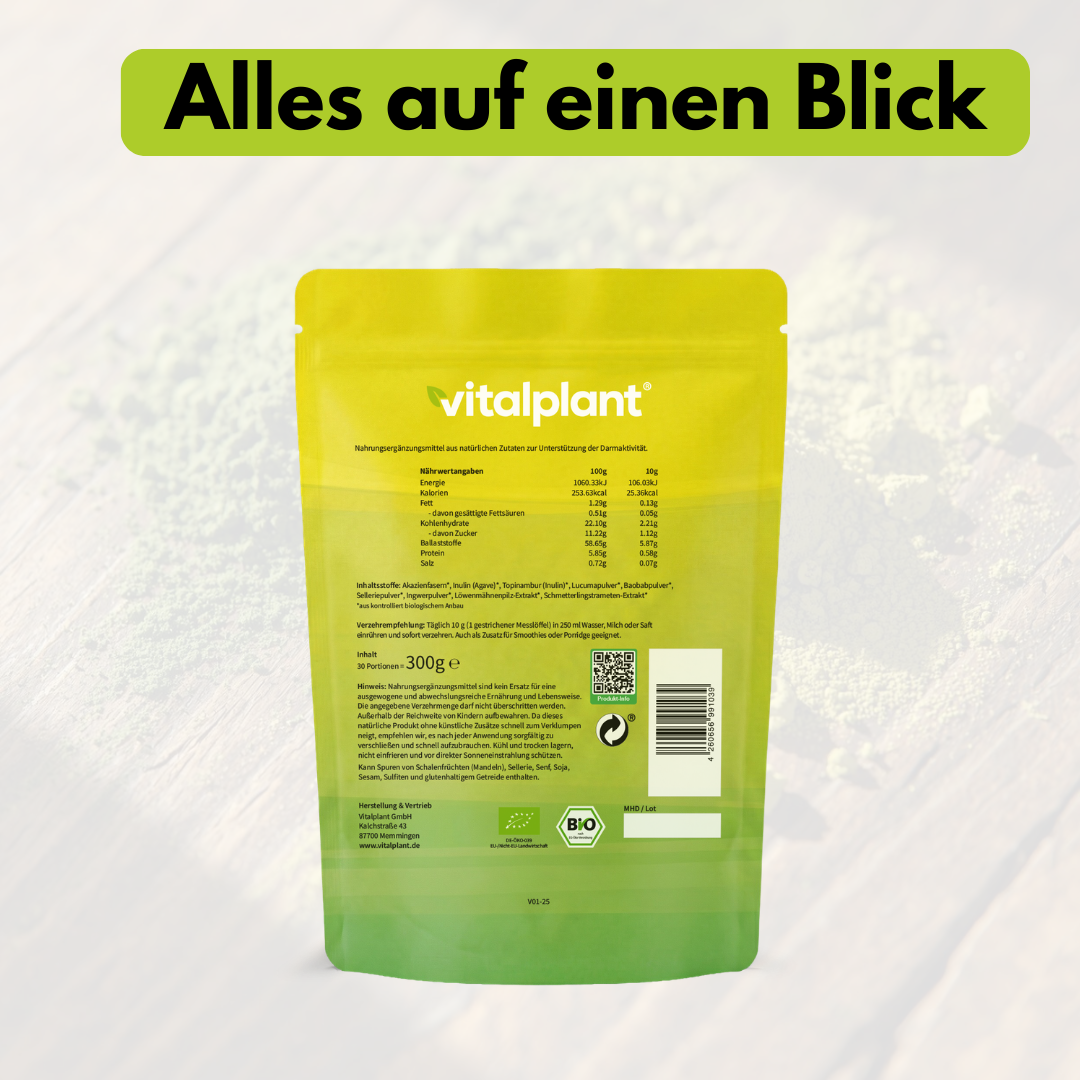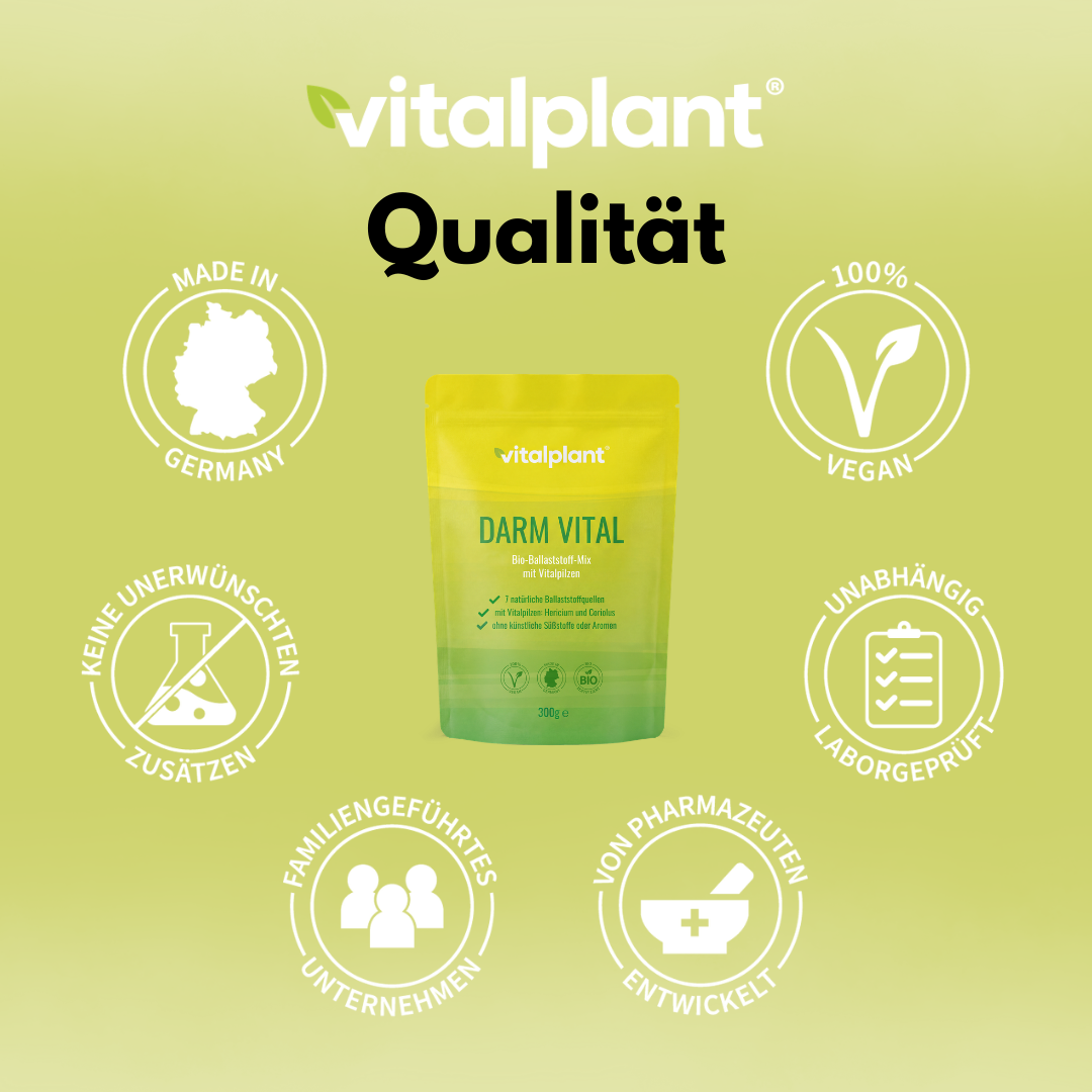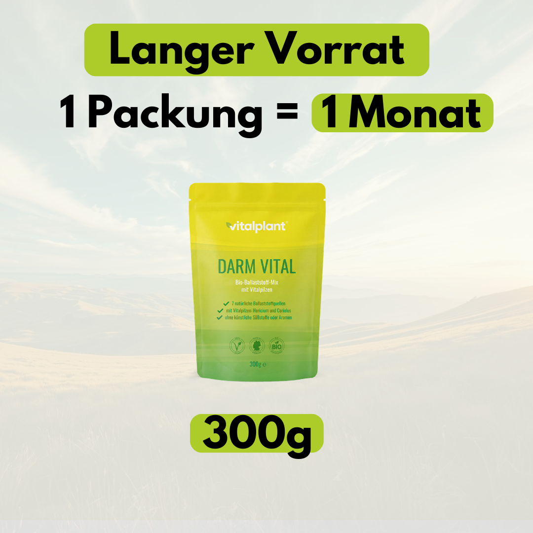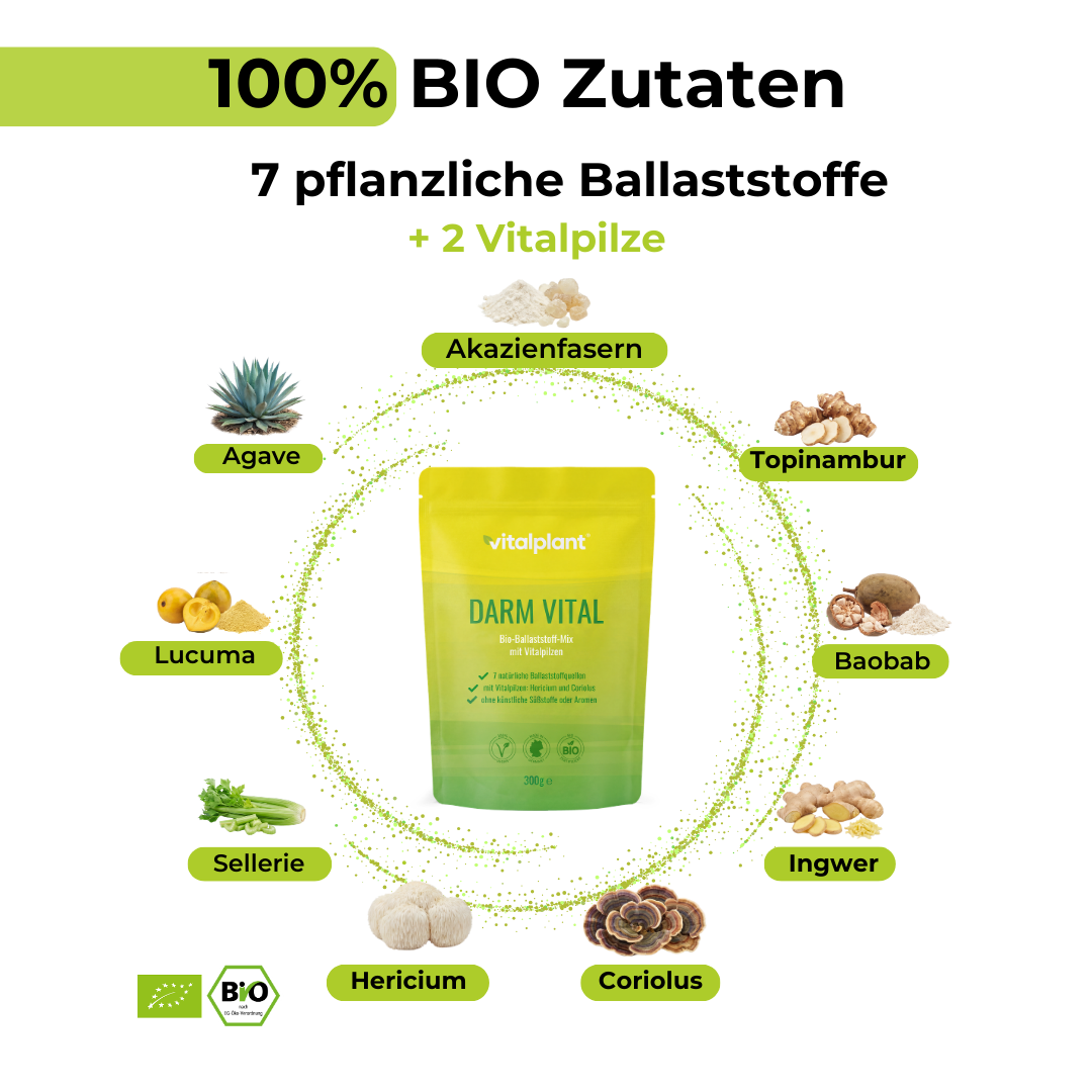 Entdecke die Kraft ausgewählter Pflanzenfasern in ihrer reinsten Form. Bio Darm Vital von Vitalplant ist ein wissenschaftlich entwickelter Ballaststoffkomplex aus sieben Superfood Pflanzenquellen und zwei sorgfältig ausgewählten Vitalpilzen – selbstverständlich aus kontrolliert biologischem Anbau gemäß EU-Öko-Verordnung.